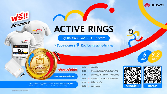 HUAWEI WATCH GT 6 Series ขอเชิญสาวกสุขภาพและผู้รักการวิ่งทุกท่าน เข้าร่วมกิจกรรม “Active Rings by HUAWEI Watch GT 6 Series” ที่จะจัดขึ้นวันที่ 7 ธันวาคม 2568 ณ เมืองโบราณ สมุทรปราการ หนึ่งในแหล่งท่องเที่ยวด้านศิลปวัฒนธรรมของไทย ภายใต้แนวคิด ‘Health Forward’ ที่มุ่งเน้นการผสานเทคโนโลยีสวมใส่ (wearables) กับการดูแลสุขภาพเชิงลึก เพื่อให้การวิ่งไม่ใช่แค่การออกกำลังกาย แต่เป็นการเดินทางแห่งแรงบันดาลใจในทุกก้าว