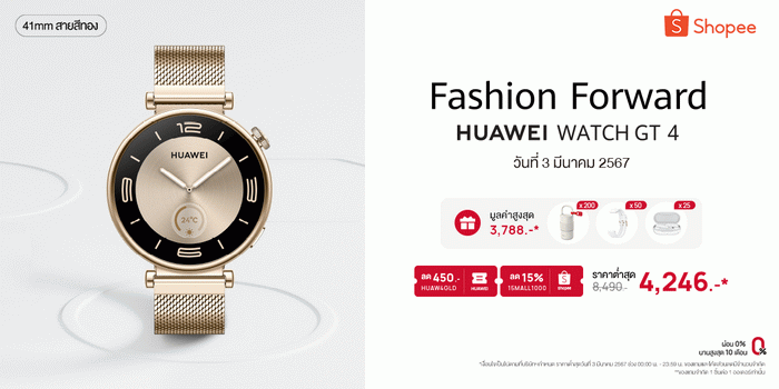 พบโปรโมชันพิเศษที่ Shopee HUAWEI WATCH GT 4 สีใหม่ Light Gold Edition กับราคาต่ำสุดเพียง 4,246 บาท[3] จากราคาปกติ 8,490 บาท เมื่อใช้ร่วมกับราคาพิเศษบน flash sale รอบ 00:00 น. พร้อมโค้ดลดจากหัวเว่ยมูลค่า 450 บาท เพียงใส่โค้ด HUAW4GLD เมื่อช้อปขั้นต่ำ 5,000 บาท และคูปองส่วนลดเพิ่มจาก Shopee 15% สูงสุด 1,000 บาท ไม่มีขั้นต่ำ เพียงใส่โค้ด 15MALL1000 นอกจากนี้ยังรับฟรีของสมนาคุณมูลค่าสูงสุดอีก 3,788 บาท ได้แก่ HUAWEI FreeBuds SE มูลค่า 1,899 บาท (สำหรับ 25 ออเดอร์แรก) HUAWEI EasyFit 2 Glacier White 18mm มูลค่า 1,299 บาท (สำหรับ 50 ออเดอร์แรก) แก้วกาแฟพกพา มูลค่า 590 บาท (สำหรับ 200 ออเดอร์แรก) พร้อมโปรบัตรเครดิตที่ร่วมรายการผ่อน 0% สูงสุด 10 เดือน ที่ร้านค้าอย่างเป็นทางการของหัวเว่ยบน Shopee ในวันที่ 3 มีนาคม 2567 วันเดียวเท่านั้น