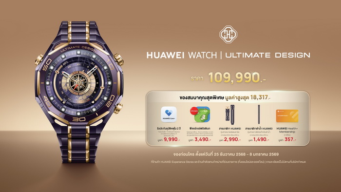 หัวเว่ย คอนซูมเมอร์ บิสสิเนส กรุ๊ป (ประเทศไทย) ต้อนรับเทศกาลแห่งความสุขอย่างยิ่งใหญ่ด้วยการเปิดตัวสมาร์ทวอทช์ระดับลักชัวรี HUAWEI WATCH ULTIMATE DESIGN Royal Gold มุ่งสู่ความเป็นที่สุดด้วยดีไซน์หรูหรากับหน้าปัดขอบเซรามิกสีม่วงที่ทำจากแร่หายาก (Rare-earth) ตัดกับทองคำ 18K ตัวเรือนทำจากโลหะเหลว (Liquid Metal) ที่แข็งแกร่งทนทาน รองรับการดำน้ำลึกได้สูงสุด 150 เมตร สื่อสารใต้น้ำได้ผ่านคลื่นโซนาร์ ดูแลสุภาพแม่นยำระดับโปรด้วย Multi-sensing X-TAP Technology มอบประสบการณ์การใช้งานอย่างอิสระด้วย eSIM ตอบโจทย์ไลฟ์สไตล์สุดหรูที่สมาร์ทอย่างเหนือระดับ เตรียมวางจำหน่ายในประเทศไทยวันที่ 9 มกราคม 2569 ที่ราคา 109,990 บาท พิเศษ! รับของสมนาคุณมูลค่าสูงสุด 18,317 บาท เมื่อสั่งจองตั้งแต่วันที่ 25 ธันวาคม 2568 ถึงวันที่ 8 มกราคม 2569 ผ่านหน้าร้าน HUAWEI Experience Store และตัวแทนจำหน่ายที่ร่วมรายการ รวมถึงร้านค้าอย่างเป็นทางการบนช่องทางออนไลน์ทั้ง HUAWEI Store, Lazada, Shopee และ TikTok Shop