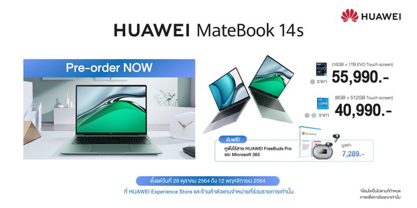 HUAWEI MateBook 14s มาพร้อมหน้าจอทัชสกรีน HUAWEI FullView Display 2.5K อัปเกรดความลื่นไหลของภาพด้วย ด้วยระบบสัมผัส Multi-touch 10 จุด อัตรารีเฟรชหน้าจอถึง 90Hz ผสานกับประสิทธิภาพจากขุมพลังแพลตฟอร์ม 11th Gen Intel® H-Series และเป็นแล็ปท็อปตัวแรกของหัวเว่ยที่ได้รับ Intel® Evo™ Platform Certification รับรองมาตรฐานการออกแบบเทคโนโลยีมาอย่างลงตัว มอบความทรงพลัง กราฟฟิกละเอียด สามารถเชื่อมต่อและถ่ายโอนข้อมูลได้อย่างรวดเร็วไร้สะดุด พร้อมเทคโนโลยีเสียงใหม่ HUAWEI Sound โดยเพิ่งเปิดตัวในประเทศไทยเมื่อปลายเดือนตุลาคม 2564 ในราคาเริ่มต้นที่ 40,990 บาท พิเศษสำหรับโปรโมชันพรีออเดอร์ รับฟรี! หูฟังไร้สายระดับโปรฯ HUAWEI FreeBuds Pro มูลค่า 5,499 บาท และ Microsoft 365 ฟรี 1 ปี มูลค่ารวม 7,289 บาท เมื่อสั่งซื้อสินค้าตั้งแต่วันที่ 28 ตุลาคม 2564 ถึง 12 พฤศจิกายน 2564 ทางเว็บไซต์ HUAWEI Store ร้านค้าอย่างเป็นทางการของหัวเว่ยบนแฟลตฟอร์มออนไลน์ต่างๆ เช่น Shopee, Lazada และ JD Central รวมถึงหน้าร้าน HUAWEI Experience Store และร้านค้าตัวแทนจำหน่ายที่ร่วมรายการ และมาพร้อมบริการรับประกันบำรุงรักษาตัวเครื่องฟรี ภายใน 2 ปีนับจากวันที่ซื้อสินค้า พร้อมให้บริการรับส่งซ่อมเครื่องถึงบ้าน