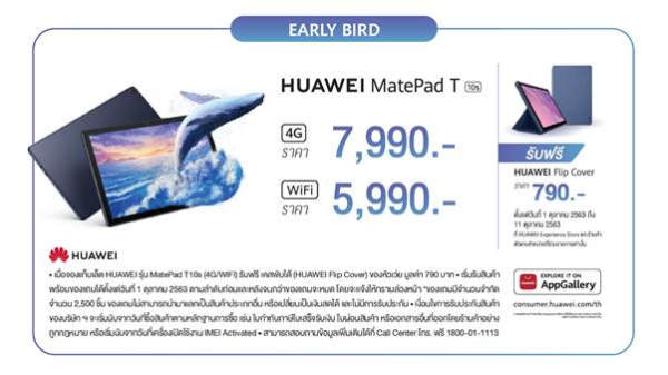 HUAWEI MatePad T 10 Series วางจำหน่ายในสี Deep Sea Blue โดย HUAWEI MatePad T 10s รุ่น WIFI ราคา 5,990 บาท และรุ่น 4G ราคา 7,990 บาท หากสั่งซื้อแบบ Early Bird ตั้งแต่วันที่ 1-11 ตุลาคม 2563 รับฟรี Flip Cover มูลค่า 790 บาท ที่ HUAWEI Experience Store และ HUAWEI Online Store ที่ https://shop.huawei.com/th และร้านค้าตัวแทนจำหน่ายที่ร่วมรายการ ในขณะที่ HUAWEI MatePad T 10 รุ่น 4G มาในราคา 4,990 บาท