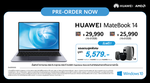 HUAWEI MateBook 14 วางจำหน่ายในสี Space Grey สำหรับชิปเซ็ต Ryzen 5 ราคา 25,990 บาท ส่วนชิปเซ็ต Ryzen 7 ราคา 29,990 บาท สั่งจองตั้งแต่วันนี้ รับฟรีของแถมสุดพิเศษ HUAWEI FreeBuds 3 กระเป๋าเป้หัวเว่ย สำหรับแล็ปท็อปและเม้าส์ มูลค่ารวมกว่า 5,579 บาท ที่ HUAWEI Experience Store และ HUAWEI Online Store ที่ https://shop.huawei.com/th และร้านค้าตัวแทนจำหน่ายที่ร่วมรายการ จนถึงวันที่ 9 ตุลาคม 2563 เท่านั้น
