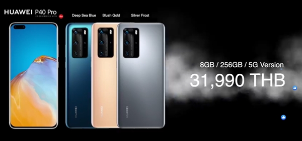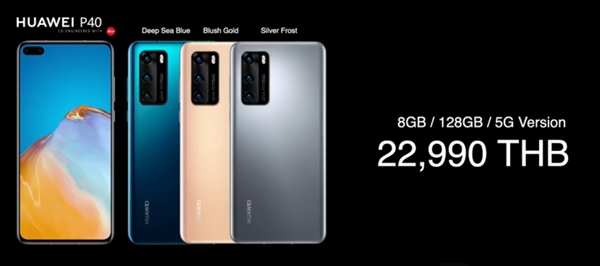 สำหรับ HUAWEI P40 Series 5G เปิดวางจำหน่ายในประเทศไทยแล้ววันนี้ มีให้เลือกทั้งหมด 2 รุ่น ได้แก่ HUAWEI P40 5G ราคา 22,990 บาท และ HUAWEI P40 Pro 5G ราคา 31,990 บาท โดยมีให้เลือกทั้งหมด 3 เฉดสี ได้แก่ Silver Frost, Blush Gold และ Deep Sea Blue พร้อมโปรโมชันพิเศษในช่วงพรีออเดอร์ ตั้งแต่วันนี้ - 30 เมษายน 2563 ส่วนกำหนดการวางจำหน่ายอย่างเป็นทางการจะเริ่มวันที่ 1 พฤษภาคม 2563 เป็นต้นไป สามารถดูรายละเอียดเกี่ยวกับโปรโมชันพรีออเดอร์ได้ที่ https://consumer.huawei.com/th/campaign/p40/