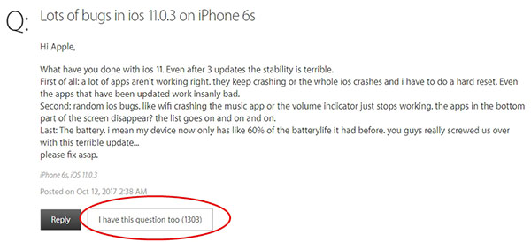 ในฟอรั่ม Official Support Communities ของ Apple ซึ่งมีกระทู้สำหรับรายงานปัญหาของ iOS 11 โดยเฉพาะ มีการโพสต์ถึงบั๊กจำนวนมากบน iPhone 6s หลังอัปเดต iOS 11.0.3 และมีคนกด “ฉันมีปัญหาเดียวกัน” มากกว่า 1,300 คน อีกด้านหนึ่งบนเว็บไซต์ Reddit (คล้าย Pantip บ้านเรา) ผู้ใช้ iPhone 7 Plus ได้ตั้งกระทู้บอกเล่าถึงปัญหาต่างๆ ที่เกิดขึ้นหลังอัปเดต ซึ่งมีคนเข้ามาตอบว่าเจอปัญหาทำนองเดียวกันจำนวนมาก โดยล่าสุดมีการตอบกระทู้มากกว่า 2,000 คอมเมนต์แล้ว