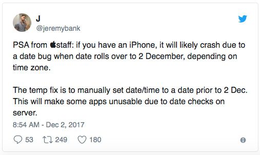 โดยเมื่อวันที่ 2 ธันวาคมที่ผ่านมา มีรายงานจากผู้ใช้ iPhone จำนวนมากว่า ตัวเครื่องรีบูตเองทุกนาทีทุก 1 นาที แม้ว่าจะทำการรีสตาร์ทเครื่องแล้ว หรือรีเซ็ตเครื่องใหม่ ปัญหาดังกล่าวก็ยังไม่หายไป ซึ่งจากการตรวจสอบในเบื้องต้น เชื่อว่า เป็นบั๊กที่เกิดขึ้นจาก iOS 11.1.2 และเริ่มทำงานวันที่ 2 ธันวาคม เวลา 00.15 น. โดยเกิดจากการแจ้งเตือนแอปพลิเคชันแบบ Local Notification (แจ้งเตือนซ้ำทุกวัน) ซึ่งบั๊กดังกล่าวไม่ได้พบบน iPhone ทุกเครื่อง ส่วนวิธีแก้ไขแบบชั่วคราวก็คือ ให้ปิดการแจ้งเตือนแอปฯ ทั้งหมด และทำการเปลี่ยนวันที่ของตัวเครื่องเป็นวันที่ 1 ธันวาคมแทน
