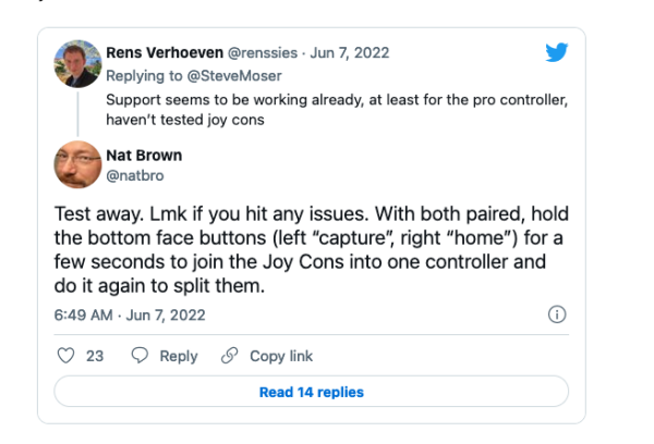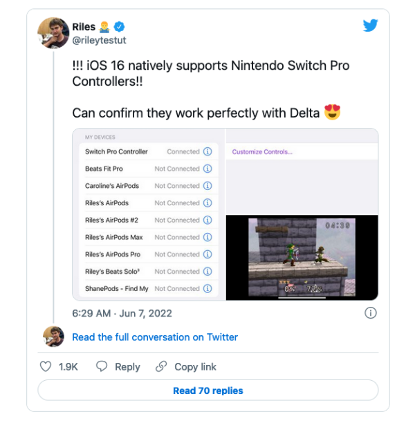 ข้อมูลดังกล่าวถูกเปิดเผยออกมาจากนักพัฒนาแอปฯ รายหนึ่งนามว่า Riles ที่ได้ค้นพบว่า iOS 16 สามารถใช้งานร่วมกับ Nintendo Switch Pro Controller ได้แบบ Native เพื่อควบคุมการเล่นเกมได้อย่างสะดวกมากยิ่งขึ้น ซึ่งสามารถเชื่อมต่อกันได้โดยตรงแบบไม่ต้องใช้แอปพลิเคชันเสริม ซึ่งนอกเหนือจาก Nintendo Switch Pro Controller แล้ว ยังมีการค้นพบด้วยว่า Joy Cons (จอยที่แถมมากับเครื่อง Nintendo Switch) ก็สามารถเชื่อมต่อกับ iOS 16 ได้เช่นเดียวกัน โดยผู้ใช้สามารถกดปุ่มล่างสุดของจอยทั้งสองฝั่งค้างไว้ เพื่อรวมเป็นจอยเดียว หรือแยกจอยเพื่อแบ่งให้เพื่อนเล่นด้วยได้