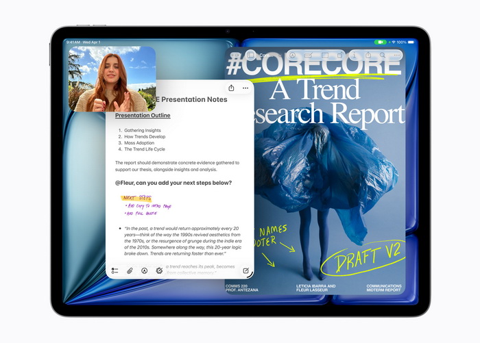 มาดูรายละเอียดกัน ชิป M4 ใน iPad Air ใหม่มาพร้อม CPU 8 คอร์ และ GPU 9 คอร์ ส่วน Neural Engine 16 คอร์ให้ประสิทธิภาพสูงกว่า NPU ของ M1 ถึง 3 เท่า เมื่อรวมกับ RAM ที่มากขึ้นและเร็วขึ้น จะส่งผลอย่างมากต่อการรัน AI บนอุปกรณ์ และก่อนจะบอกว่า “ไม่สนใจ AI” อย่าลืมว่าสิ่งนี้รวมถึงฟีเจอร์อย่างการลบฉากหลังในวิดีโอใน Final Cut Pro ด้วย
