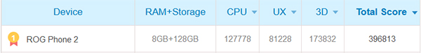 Benchmark ของ ROG Phone 2 บนแพลตฟอร์ม AnTuTu (ข้อมูล ณ วันที่ 14 กันยายน 2019)