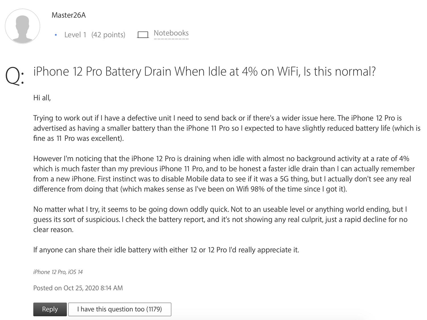 โดยแหล่งข่าวเผยว่า ปัญหาดังกล่าวถูกพบมากในกลุ่มผู้ใช้ iPhone 12 Pro และ iPhone 12 mini ที่เปิดประเด็นด้วยผู้ใช้นามว่า Master26A ในหน้า Forum ของเว็บไซต์ Apple เอง ที่เจ้าตัวเผยว่า iPhone 12 Pro ที่ใช้อยู่นั้น แบตเตอรี่หมดไวมากทั้ง ๆ ที่เปิดแบบ Standby ไว้ และเมื่อจดตัวเลขดูพบว่า แบตเตอรี่ลดไป 4% ทุก ๆ ชั่วโมงเลยทีเดียว