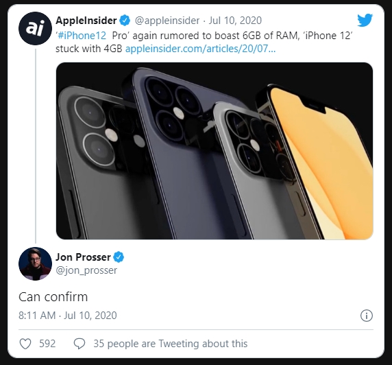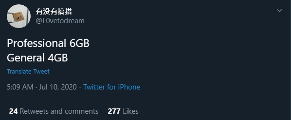 ข้อมูลดังกล่าวมาจากแหล่งข่าวรายหนึ่งนามว่า L0vettodream ที่ได้ออกมาเปิดเผยเบาะแสเป็นข้อความสั้นๆ ว่า “Professional 6GB General 4GB” ซึ่งแม้ว่าแหล่งข่าวจะไม่ได้เปิดเผยว่าคืออะไร แต่หากย้อนกลับไปดูข้อมูลของแหล่งข่าวรายนี้ จะพบว่ามีการรายงานเกี่ยวกับข่าวคราวของ iPhone 12 มาโดยตลอด ซึ่งก็น่าจะเดาได้ไม่ยากว่า 6GB และ 4GB ในที่นี้คือหน่วยความจำ RAM ของ iPhone 12 และ iPhone 12 Pro นั่นเอง