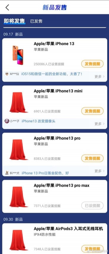 ข้อมูลดังกล่าวถูกเปิดเผยออกมาจาก PandalsBald แหล่งข่าวรายหนึ่งที่ได้บันทึกภาพสกรีนช็อตบนแพลตฟอร์มร้านค้าออนไลน์ในประเทศจีน เผยให้เห็นถึงกำหนดการวางจำหน่าย iPhone 13 ที่จะขายวันที่ 17 กันยายนที่จะถึงนี้ โดยมีให้เลือกทั้งหมด 4 รุ่น ได้แก่ iPhone 13, iPhone 13 mini, iPhone 13 Pro และ iPhone 13 Pro Max ส่วน AirPods 3 หูฟังไร้สายรุ่นใหม่ล่าสุดจะมีการวางจำหน่ายภายหลังในวันที่ 30 กันยายนเป็นต้นไป