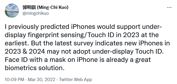 Ming-Chi Kuo คาดว่า ระบบสแกนลายนิ้วมือใต้หน้าจอจะพร้อมใช้งานบน iPhone ประมาณปี 2025 หรือในอีก 3 ปีข้างหน้า ส่วนกล้องซูมแบบ periscope จะมาในปี 2023 ซึ่งการที่ Apple ยังไม่ใช้ระบบสแกนนิ้วใต้จอ เป็นเพราะบบ Face ID ที่ใช้อยู่นั้นมีประสิทธิภาพสูงอยู่แล้ว