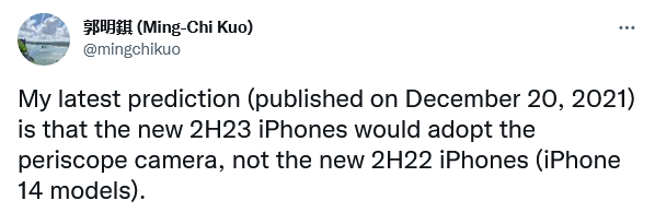 Ming-Chi Kuo นักวิเคราะห์และสายข่าว Apple ที่รู้จักกันดี ได้เปิดเผยข้อมูลเพิ่มเติมของ iPhone 14 ผ่าน twitter ส่วนตัว โดยอ้างว่า iPhone 14 ที่กำลังจะเปิดตัวในปีนี้ จะยังไม่มีเซ็นเซอร์สแกนลายนิ้วมือใต้หน้าจอ และไม่มีกล้องซูมแบบ periscope แม้จะเป็นเทคโนโลยีที่เริ่มจะเก่าแล้วก็ตาม