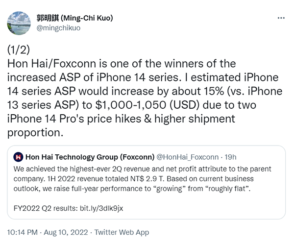 ทั้งนี้ Kuo ยังกล่าวอีกว่า ผู้ที่ได้รับประโยชน์จากการปรับราคาของ iPhone 14 Pro Series อาจไม่ใช่ Apple แต่เป็นโรงงานประกอบตัวเครื่องอย่าง Foxconn ที่ Apple ได้จ้างประกอบตัวเครื่องทั้งหมดกว่า 60-70% ซึ่งล่าสุดได้โชว์กำไรที่พุ่งสูงขึ้นในช่วงไตรมาสที่สอง โดยคาดว่าน่าจะเป็นผลมาจากราคาสินค้าเฉลี่ย ASP ที่สูงขึ้นประมาณ 1,000 - 1,050 เหรียญสหรัฐฯ (35,360 - 37,128 บาท) มากกว่า iPhone 13 Pro Series รุ่นก่อนถึง 15%