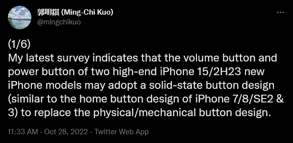 Ming-Chi Kuo นักวิเคราะห์ชื่อดัง เปิดเผยผ่าน Twitter ว่า iPhone โมเดลไฮเอนด์ที่จะเปิดตัวในปีหน้า จะเปลี่ยนไปใช้ปุ่มบนตัวเครื่องแบบ Solid state หรือปุ่มสัมผัสที่ตอบสนองด้วยการสั่นเหมือนปุ่มโฮมของ iPhone 7 และจะเพิ่มระบบสั่น Taptic Engine ที่ด้านซ้ายและขวาของตัวเครื่องด้วย ซึ่งหมายความว่าตัวเครื่องจะไม่มีปุ่มกดใด ๆ เลย ไม่ว่าจะเป็นปุ่มข้าง หรือปุ่มปรับเสียง