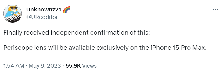ลือกันมาสักพักแล้วว่า iPhone 15 Pro Max ซึ่งเป็นรุ่นท็อปประจำซีรีส์จะมีฟีเจอร์พิเศษหลาย ๆ อย่างที่เหนือกว่ารุ่น Pro หนึ่งในนั้นคือเลนส์ซูมที่ซูมได้ไกลกว่า ล่าสุดแหล่งข่าวหลุด Unknownz21 ก็ได้ยืนยันเรื่องนี้บนทวิตเตอร์ครับ