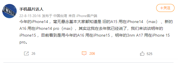 แหล่งข่าววงในจาก Weibo อ้างว่า iPhone 15 Pro และ iPhone 15 Pro Max จะได้ใช้ชิปเซ็ต A17 ที่ผลิตด้วยกระบวนการระดับ 3 นาโนเมตร ส่วน iPhone 15 กับ iPhone 15 Max จะใช้ชิปเซ็ต A16 กระบวนการผลิต 54 นาโนเมตร ที่เคยใช้ใน iPhone 14 Pro และ iPhone 14 Pro Max