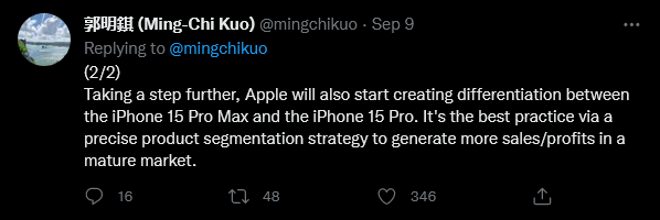 Apple จะพยายามทำให้ iPhone 15 รุ่นธรรมดากับรุ่น Pro มีความแตกต่างกันมากขึ้น เพื่อจูงใจให้ผู้บริโภคซื้อรุ่น Pro มากขึ้น ซึ่งจะส่งผลให้ยอดการจัดส่งของ iPhone 15 Pro สูงขึ้น และจะดันให้ราคาขายเฉลี่ย (ASP) ของ iPhone 15 Series สูงขึ้นตามไปด้วย