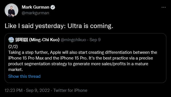 นอกจากนี้ Kuo ยังได้คาดการณ์ว่า Apple จะทำให้ iPhone 15 Pro ต่างจากรุ่นธรรมดามากขึ้น แต่ไม่ได้ระบุเจาะจงว่าเป็นด้านใด ขณะเดียว Gurman คาดว่า Apple จะเปลี่ยนชื่อรุ่นท็อปสุดอย่าง iPhone 15 Pro Max ไปเป็น iPhone 15 Ultra ด้วย ซึ่งก็มีความเป็นไปได้ค่อนข้างมากเพราะล่าสุด Apple Watch และชิปเซ็ตตระกูล M-series ก็เริ่มใช้ชื่อรุ่น Ultra กันไปแล้ว