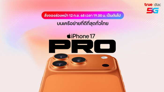 ทรู ดีแทค 5G เตรียมวางจำหน่าย iPhone 17, iPhone Air, iPhone 17 Pro, iPhone 17 Pro Max โดยลูกค้าสามารถสั่งจอง iPhone รุ่นใหม่ทั้งหมดได้ตั้งแต่วันศุกร์ที่ 12 กันยายน 2568เวลา 19.00 น. และจะพร้อมจำหน่ายในวันศุกร์ที่ 19 กันยายน 2568 โปรดตรวจสอบรายละเอียดวันวางจำหน่ายของ Apple Watch Series 11, Apple Watch SE 3, Apple Watch Ultra 3 และ AirPods Pro 3 อีกครั้ง ติดตามรายละเอียดราคา และการวางจำหน่ายเพิ่มเติมได้ที่ https://www.true.th/promotion/devices/iphone-17-pro