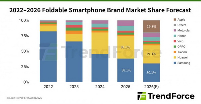 Apple ถือเป็นผู้เล่นที่เข้าสู่ตลาดสมาร์ตโฟนจอพับค่อนข้างช้า แต่บรรดานักวิเคราะห์ของ TrendForce เชื่อว่า ความต้องการที่สะสมอยู่ในกลุ่มผู้ใช้ Apple ที่อยากลองใช้สมาร์ตโฟนจอพับ ผสานกับความแข็งแกร่งของแบรนด์และความภักดีต่อระบบนิเวศของ Apple จะเป็นแรงผลักดันให้บริษัทก้าวขึ้นเป็นหนึ่งในผู้นำตลาดของเซกเมนต์นี้