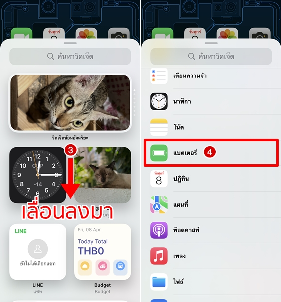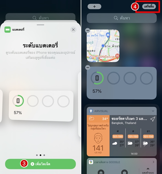 3. จะเข้าสู่ขั้นตอนการเพิ่มวิดเจ็ตเหมือนก่อนหน้านี้ ให้เลือกแบตเตอรี่ แล้วกด เพิ่มวิดเจ็ต เหมือนเดิม