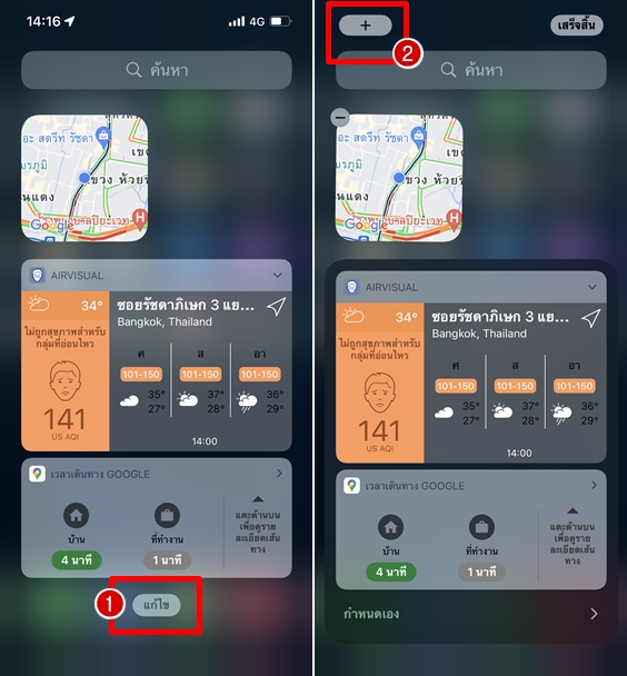 6. เราจะถูกพามายังหน้าโฮมพร้อมกับวิดเจ็ตที่เลือก ในขั้นตอนนี้เราสามารถเลื่อนตำแหน่งของวิดเจ็ตบนหน้าจอได้ เมื่อได้ตำแหน่งที่พอใจแล้ว ให้กดที่ เสร็จสิ้น มุมขวาบน