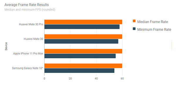 จาก Gamebench แอปพลิเคชันทดสอบการเล่นเกมของสมาร์ทโฟน ที่ทำการทดสอบ iPhone 11 Pro Max, HUAWEI Mate 30 Pro และ Samsung Galaxy Note 10 สามเรือธงในปี 2019 ในด้านต่างๆ มีรายละเอียดดังนี้