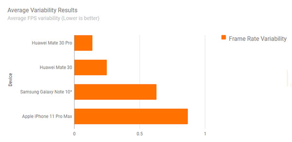 โดยค่าความต่างของเฟรมเรทสูงสุด และต่ำสุดในรุ่น HUAWEI Mate30 Pro ทำได้ดีที่สุดในสามรุ่น