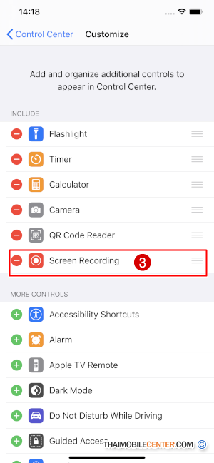 ในหน้านี้ให้เรามองหา Screen Recording ถ้าอยู่ในเมนูด้านบนอยู่แล้วก็ไม่ต้องทำอะไร แต่ถ้าไม่มีให้เราเลื่อนหาลงมาด้านล่าง และกดเครื่องหมาย + สีเขียว Screen Recording จะย้ายไปอยู่ที่เมนูด้านบน เท่านี้เราก็พร้อมใช้งานแล้วครับ