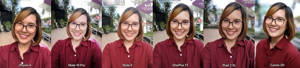 iPhone X : เอกลักษณ์อย่างหนึ่งของกล้องหน้า iPhone เกือบทุกรุ่นคือการถ่ายภาพตามสภาพจริงเหมือนที่ตาเห็น ซึ่งกล้อง TrueDepth ของ iPhone X ก็ยังเป็นเช่นเดียวกัน แต่การวัด White Balance ยังไม่ตรงเท่าที่ควร ทำให้หน้าตัวแบบออกส้มเกินกว่าสีผิวจริง แต่การเบลอฉากหลังถือว่าทำได้ดีทีเดียว