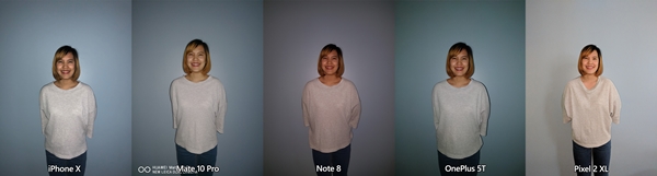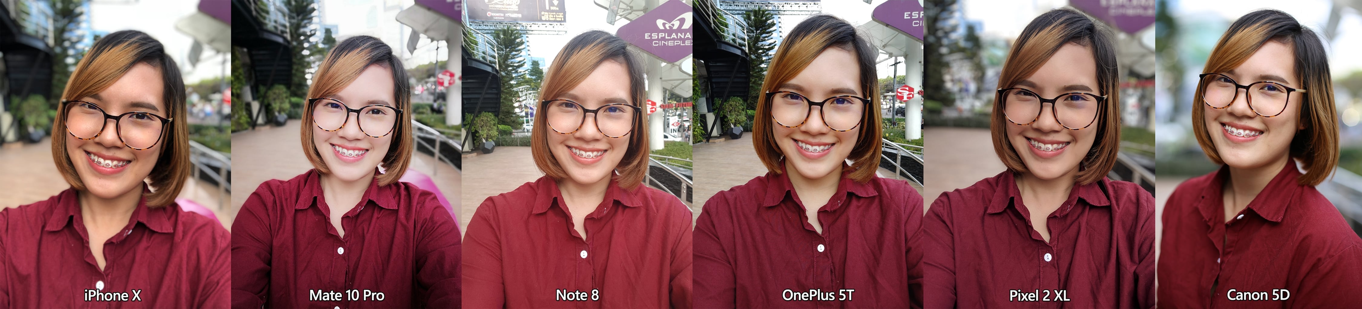 Samsung Galaxy Note 8 : สำหรับ Note 8 มีการเร่งแสงสว่างของภาพเพิ่มขึ้นแบบทั้งภาพ ตัวกล้องไม่ค่อยมีการเบลอฉากหลัง กล้องหน้ามีการปรับผิวหน้าให้เนียนเล็กน้อยไม่มากจนเกินไปและมีแสงส้มอมชมพูเหมาะสำหรับคนที่ชอบเซลฟีแบบปรับแต่งนิดๆ แต่ด้วยความที่ภาพสว่างกว่ารุ่นอื่นทำให้สูญเสียรายละเอียดบางส่วนไปเช่นกัน