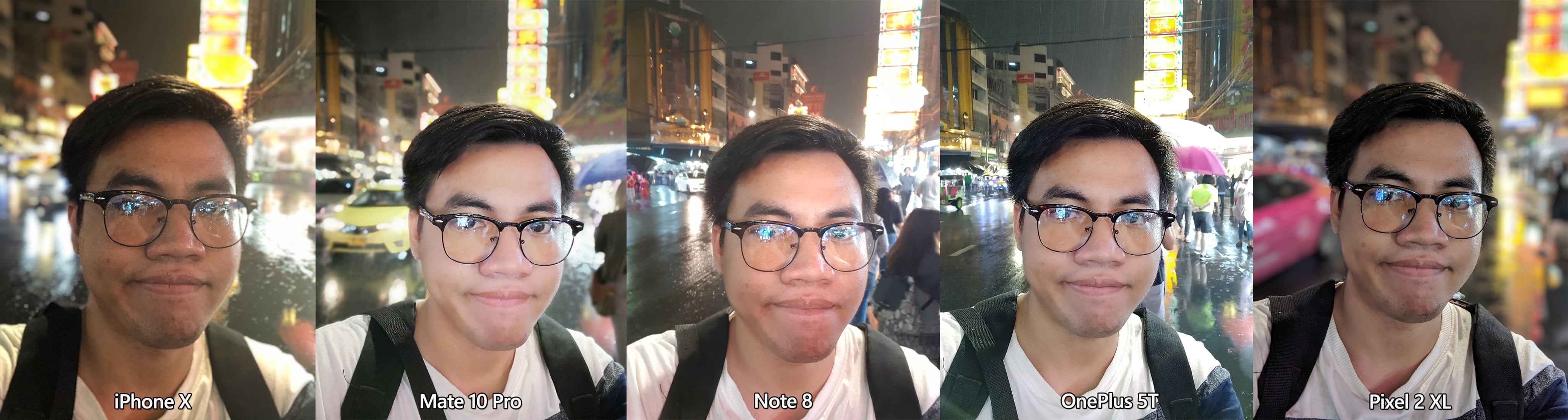 iPhone X : iPhone X กับกล้องหน้าในตอนกลางคืนถือว่ามีผลงานไม่ค่อยประทับใจนัก เพราะความคมชัด และรายละเอียดของภาพหายไปบางส่วน รวมถึงการวัดแสงที่มืดกว่าภาพอื่น แต่ก็ดูจะเป็นมือถือที่คงคาแรคเตอร์ภาพถ่ายดูสมจริงมากที่สุด