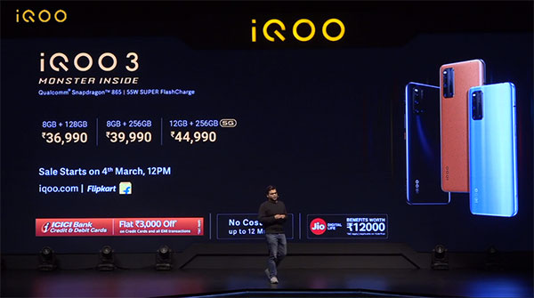 iQOO 3 5G มีตัวเลือก 3 สี ได้แก่ Volcano Orange, Quantum Silver และ Tornado Black โดยจะเริ่มวางจำหน่ายในประเทศอินเดียในวันที่ 4 มีนาคมนี้เป็นต้นไป กับ 3 รุ่นย่อย ดังนี้