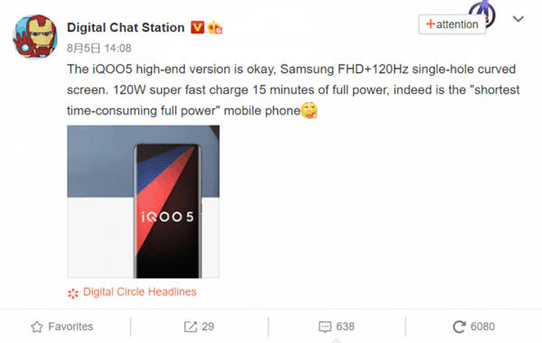 Digital Chat Station แหล่งข่าวจากสื่อสังคมออนไลน์ขนาดใหญ่ของประเทศจีนอย่าง Weibo ได้ออกมาเปิดเผยให้เห็นถึงภาพเรนเดอร์ และสเปกบางส่วนของ iQOO 5 โดยสมาร์ทโฤนรุ่นดังกล่าวจะมาพร้อมกับจุดเด่นด้านหน้าจอ AMOLED แบบของโค้งที่ผลิตโดย Samsung ความละเอียดระดับ Full HD+ พร้อมค่า Refresh Rate ระดับ 120Hz ช่วยให้การแสดงเป็นไปอย่างลื่นไหลเนียนตา โดยที่หน้าบนมุมซ้ายของหน้าจอจะมีการเจาะรูขนาดเล็กเพื่อติดตั้งกล้องหน้าเซลฟี่ด้วย