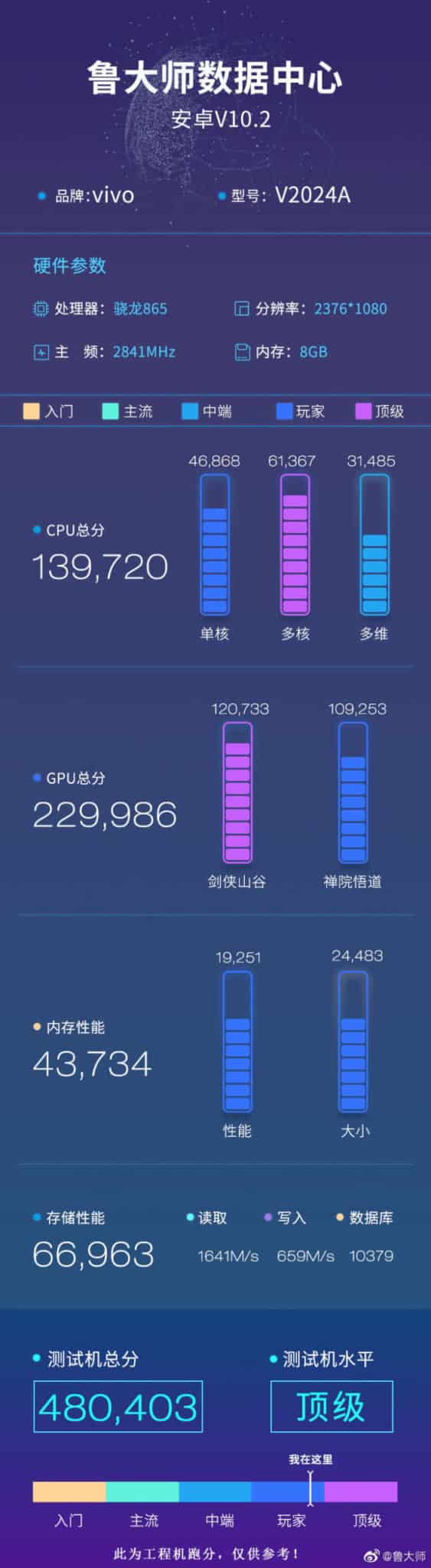 เมื่อไม่นานมานี้ iQOO 5 ได้ไปปรากฏตัวบน Master Lu อีกหนึ่งแหล่งทดสอบประสิทธิภาพสมาร์ทโฟนยอดนิยมพร้อมกับเปิดเผยให้เห็นถึงสเปกบางส่วน โดย iQOO 5 จะมาพร้อมกับจุดเด่นด้านการได้ใช้ชิปเซ็ตตัวท็อปอย่าง Snapdragon 856 พร้อมหน่วยประมวลผลกราฟิก Adreno 650 ประกบคู่กับหน่วยความจำ RAM ขนาด 8GB และหน่วยความจำภายในความจุ 128GB โดยจากสเปกทั้งหมดนี้ทำให้ iQOO 5 สามารถทำคะแนนประมวลผลของ CPU บน Master Lu ไปได้ทั้งหมด 229,986 คะแนน และทำคะแนนการประมวลผลในส่วนของ GPU ได้ทั้งหมด 139,720 คะแนน