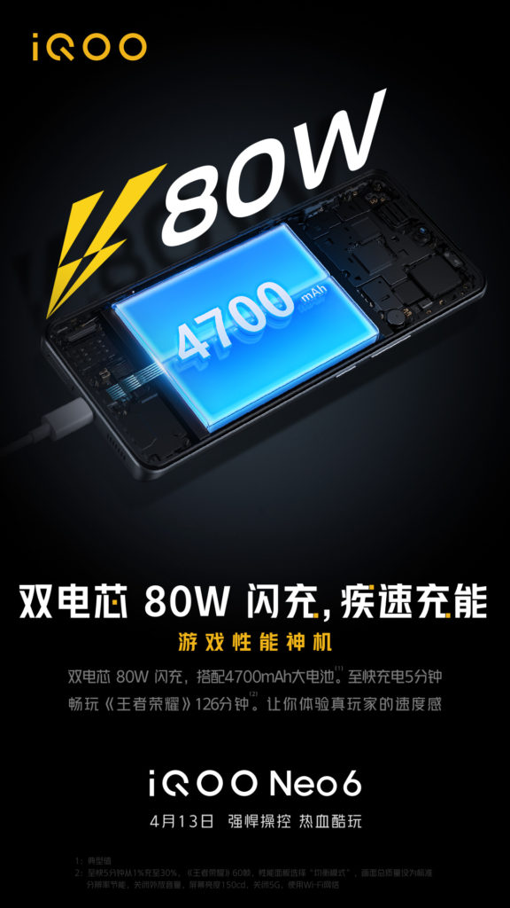 โปสเตอร์ทีเซอร์ของสมาร์ทโฟน iQOO Neo 6 ยืนยันแบตเตอรีความจุ 4700 mAh พร้อมรองรับระบบชาร์จไว 80W ชาร์จเพียงแค่ 5 นาที สามารถเล่นเกมได้นานถึง 2 ชั่วโมง