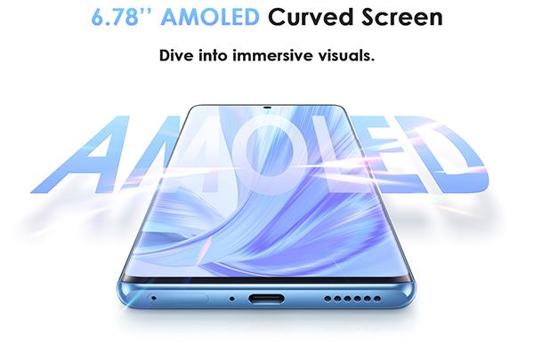 หน้าจอแสดงผลของ itel S23+ ก็ไม่ธรรมดาเช่นกัน เพราะเป็นจอแบบ AMOLED ขอบโค้ง ขนาด 6.78 นิ้ว รองรับขอบเขตสี DCI-P3 99% บนความสว่างสูงสุด 500 nits พร้อมด้วยกระจกกันรอย Gorilla Glass 5 และยังสแกนนิ้วบนจอได้ ซึ่งหายากมาก ๆ ในสมาร์ทโฟนราคาไม่เกิน 5,000 บาท