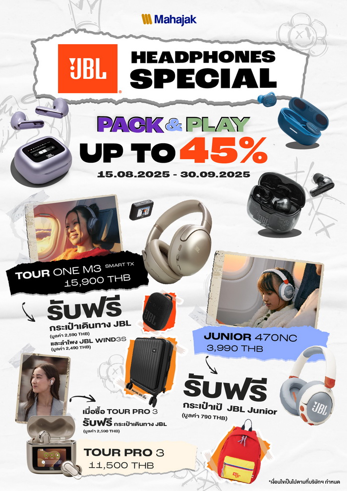 บริษัท มหาจักรดีเวลอปเมนท์ จำกัด จัดแคมเปญ JBL Headphone Special ภายใต้คอนเซ็ปต์ Pack & Play ตอบโจทย์ทุกไลฟ์สไตล์ ครบทั้งความคุ้มค่า และการใช้งาน ยกขบวนหูฟัง JBL ลดสูงสุดถึง 45% พร้อมของแถมสุดพิเศษในรุ่นที่ร่วมรายการ อาทิ กระเป๋าเดินทาง JBL, ลำโพงพกพา JBL Wind3s และกระเป๋าเป้ JBL Junior เพื่อมอบความคุ้มค่าให้แก่ลูกค้ามากยิ่งขึ้น