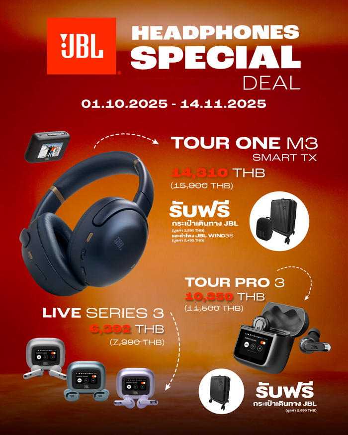 บริษัท มหาจักรดีเวลอปเมนท์ จำกัด ผู้นำเข้าและจัดจำหน่ายผลิตภัณฑ์แบรนด์ JBL อย่างเป็นทางการในประเทศไทย จัดแคมเปญสุดพิเศษ “JBL Headphones Special Deal” มอบประสบการณ์เสียงเหนือระดับให้คนรักเสียงเพลงได้สัมผัสความคุ้มค่ากว่าที่เคย กับ โปรโมชันลดแรง ลดหนัก คุ้มที่สุดแห่งปีเมื่อซื้อหูฟัง JBL รุ่นยอดนิยม ในราคาสุดพิเศษ พร้อมรับของแถมสุดพรีเมียม อาทิ กระเป๋าเดินทาง JBL ดีไซน์หรู และ ลำโพงพกพา JBL Wind 3S ที่มาพร้อมฟังก์ชันกันน้ำและเสียงทรงพลัง ให้คุณพกพาความสนุกไปได้ทุกที่ ตั้งแต่วันนี้ – 14 พฤศจิกายน 2568 เท่านั้น