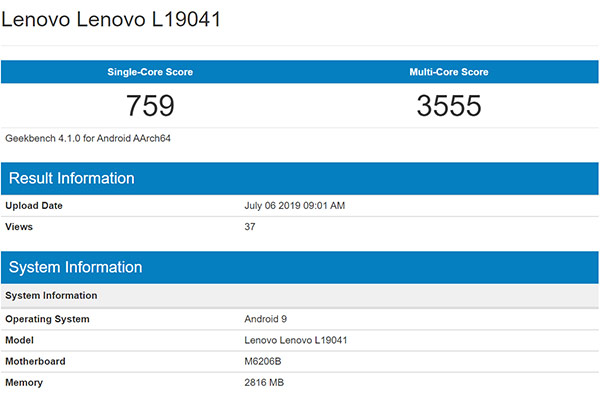 Lenovo A6 Note (Lenovo L19041) ยังถูกจับทดสอบโดยเว็บดังอย่าง Geekbench ด้วยเช่นกัน ซึ่งมีผลทดสอบการประมวลผลแบบหลายแกน (Multi-Core) ที่ 3,555 คะแนน และแบบแกนเดี่ยว (Single-Core) ที่ 759 คะแนน พร้อมกับสเปกในเบื้องต้นอย่าง ชิปเซ็ต MediaTek Helio P22 (MT6762V) ที่มีความเร็ว 2.0 GHz, หน่วยความจำแรม (RAM) ขนาด 3GB และระบบปฏิบัติการ Android 9.0 Pie