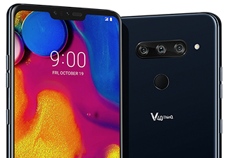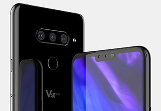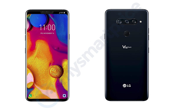 จากภาพจะเห็นได้ว่าบนตัวเครื่องมีการระบุชื่อรุ่นว่า LG V40 ThinQ พร้อมดีไซน์จอไร้ขอบโฉมใหม่ที่มีรอยบาก (Notch) ด้านบนตามสมัยนิยม และที่น่าสนใจคือมีกล้องถ่ายภาพมากถึง 5 ตัวในเครื่องเดียว โดยแบ่งออกเป็นกล้องคู่ (Dual Camera) ที่ด้านหน้า และกล้องหลังอีก 3 ตัว (Triple Camera) ที่เรียงกันในแนวนอน ถัดลงมาที่ด้านล่างเป็นเซ็นเซอร์สแกนลายนิ้วมือ