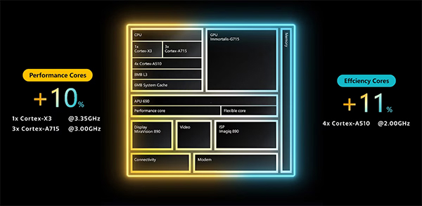 MediaTek Dimensity 9200+ ยังคงผลิตด้วยกระบวนการ N4P ของ TSMC เช่นเดิม แต่มี clock speed ที่สูงขึ้นทั้ง CPU และ GPU โดยเป็นชุดประมวลผล octa-core ประกอบด้วย 1x Cortex-X3 ความเร็ว 3.35GHz, 3x Cortex-A715 ความเร็ว 3.0GHz และ 4x Cortex-A510 ความเร็ว 2.0GHz ส่วนหน่วยประมวลผลกราฟิกหรือ GPU จะเป็น ARM Immortalis G715 ตัวเดิม แต่เพิ่มพลังการประมวลผลเพิ่มขึ้นเฉลี่ย 17%