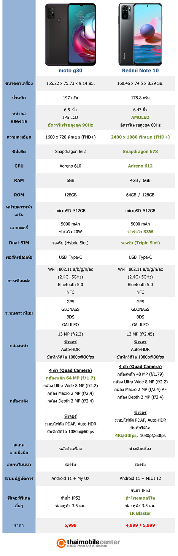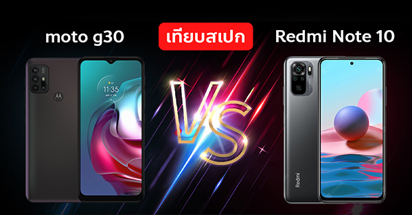 เมื่อเร็วๆ นี้เพิ่งจะมีการเปิดตัว moto g30 ในประเทศไทยไปหมาดๆ ซึ่งก็ได้รับความสนใจจากกลุ่มผู้ใช้ระดับกลางไปไม่น้อย ที่น่าสนใจคือ moto g30 เปิดราคาไทยมาที่ 5,999 บาท ซึ่งเท่ากับ Redmi Note 10 รุ่น 6+128GB พอดี ในวันนี้เราจึงจับสมาร์ทโฟนทั้ง 2 รุ่นมาเปรียบเทียบสเปกกัน เพื่อให้เห็นจุดเด่น-จุดด้อยของทั้งสองรุ่นนี้ชัดขึ้นครับ
