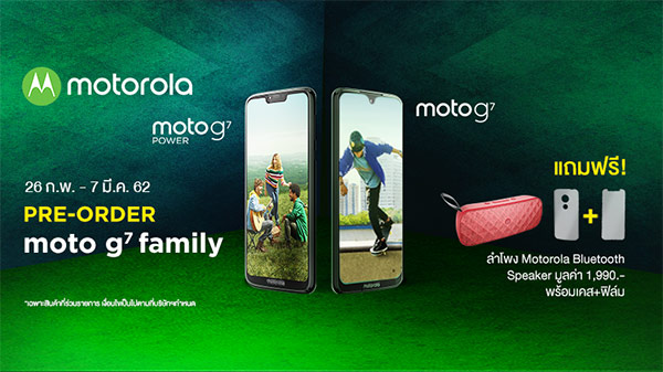 ล่าสุดนี้ทาง Motorola ประเทศไทยก็ได้ประกาศให้สั่งจอง (Pre-Order) สำหรับสองสมาร์ทโฟนรุ่นใหม่จากตระกูล Moto G7 Series อย่าง Moto G7 และ Moto G7 Power อย่างเป็นทางการแล้ว ในราคา 7,990 บาท และ 5,990 บาท ตามลำดับ โดยสามารถสั่งจองได้ถึงวันที่ 7 มีนาคมนี้ พร้อมรับของแถมอย่าง ลำโพง Motorola Bluetooth Speaker มูลค่า 1,990 บาท พร้อมเคส และฟิล์มกันรอย ฟรีในทุกออเดอร์
