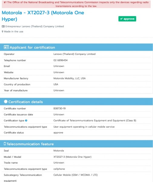 แต่ล่าสุดดูเหมือนว่า Motorola One Hyper อาจเปิดตัวให้เห็นในเร็วๆ นี้ และอาจมีการนำเข้ามาวางขายในประเทศไทยด้วย หลังสมาร์ทโฟน Motorola เลขรหัสโมเดล XT2027-3 หรือ Motorola One Hyper ได้ผ่านการรับรองจาก กสทช. ในบ้านเราเป็นที่เรียบร้อยแล้ว ซึ่งถือเป็นอีกหนึ่งในขั้นตอนสำคัญก่อนที่จะมีการวางขายอุปกรณ์สื่อสาร ทำให้มีความเป็นไปได้ว่า Motorola One Hyper อาจมีการเข้ามาวางขายในประเทศไทยทันทีหลังเปิดตัว
