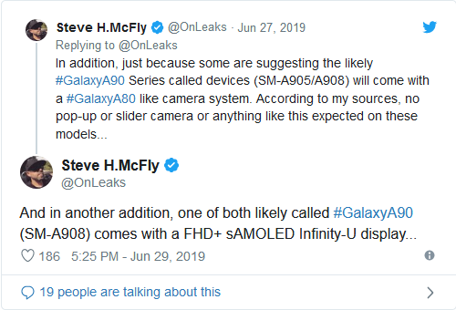 ข้อมูลล่าสุดนี้มาจาก Steve H. McFly หรือ @OnLeaks หนึ่งใน tipster ชื่อดังเจ้าเก่า ซึ่งอ้างว่า Samsung Galaxy A90 จะไม่มีกล้องหมุนแบบ Galaxy A80 อย่างที่คาดกัน และจะไม่ใช้กล้อง pop-up หรือกล้องสไลด์ด้วย แต่จะเป็นกล้องหน้าทรงหยดน้ำแบบ Inifinity-U แทน พร้อมหน้าจอ Super AMOLED ความละเอียด FHD+