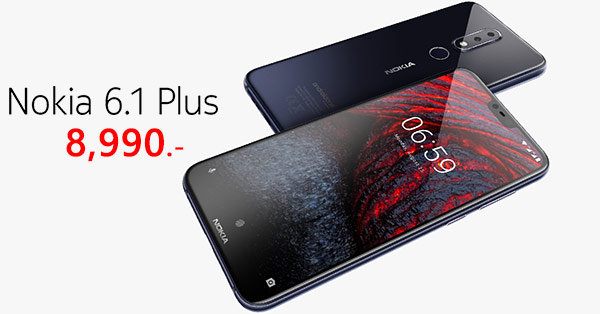 ล่าสุดนี้ทาง Nokia ประเทศไทยได้จัดงานเปิดตัว Nokia 6.1 Plus สมาร์ทโฟนรุ่นใหม่ที่โดดเด่นด้วยการดีไซน์ Full Screen จอไร้ขอบโฉมใหม่ พร้อมรอยบาก (Notch) ตามสมัยนิยมในอัตราส่วน 19:9 และใช้งานระบบกล้องคู่ (Dual Camera) พร้อมฟีเจอร์ Bothie รวมถึงลูกเล่นใหม่อย่างสติกเกอร์ AR 3D และที่สำคัญยังเป็นสมาร์ทโฟนจากโครงการ Android One อีกด้วย ซึ่งเปิดราคาที่ 8,990 บาท