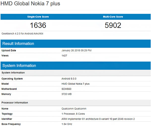 รายชื่อของ Nokia 7 Plus ที่คาดกันว่าจะเป็นรุ่นอัปเกรดของ Nokia 7 ได้ไปปรากฎอยู่บนเว็บทดสอบประสิทธิภาพสมาร์ทโฟนชื่อดังอย่าง Geekbench พร้อมเผยให้เห็นผลทดสอบการประมวลผลแบบหลายแกน (Multi-Core) ที่ 5,902 คะแนน และแบบแกนเดี่ยว (Single-Core) ที่ 1,636 คะแนน รวมถึงคุณสมบัติตัวเครื่องในบางส่วนอย่างชัดเจน ได้แก่ ชิปเซ็ต Snapdragon 660 พร้อมหน่วยความจำแรม (RAM) ขนาด 4GB และทำงานอยู่บนระบบปฏิบัติการ Android 8.0 Oreo