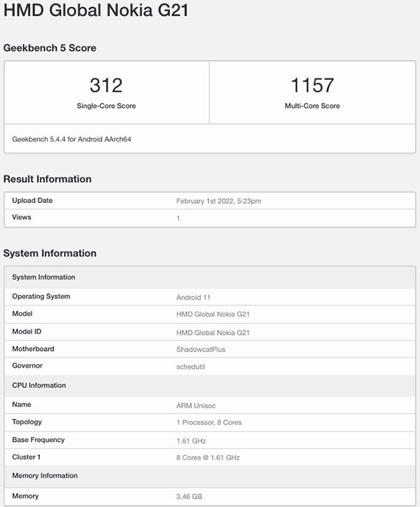 Nokia G21 ผ่านการทดสอบบน Geekbench มากับชิป Unisoc T606 และอาจมีกล้องคู่ 50+2MP คาดเปิดตัวเดือนนี้